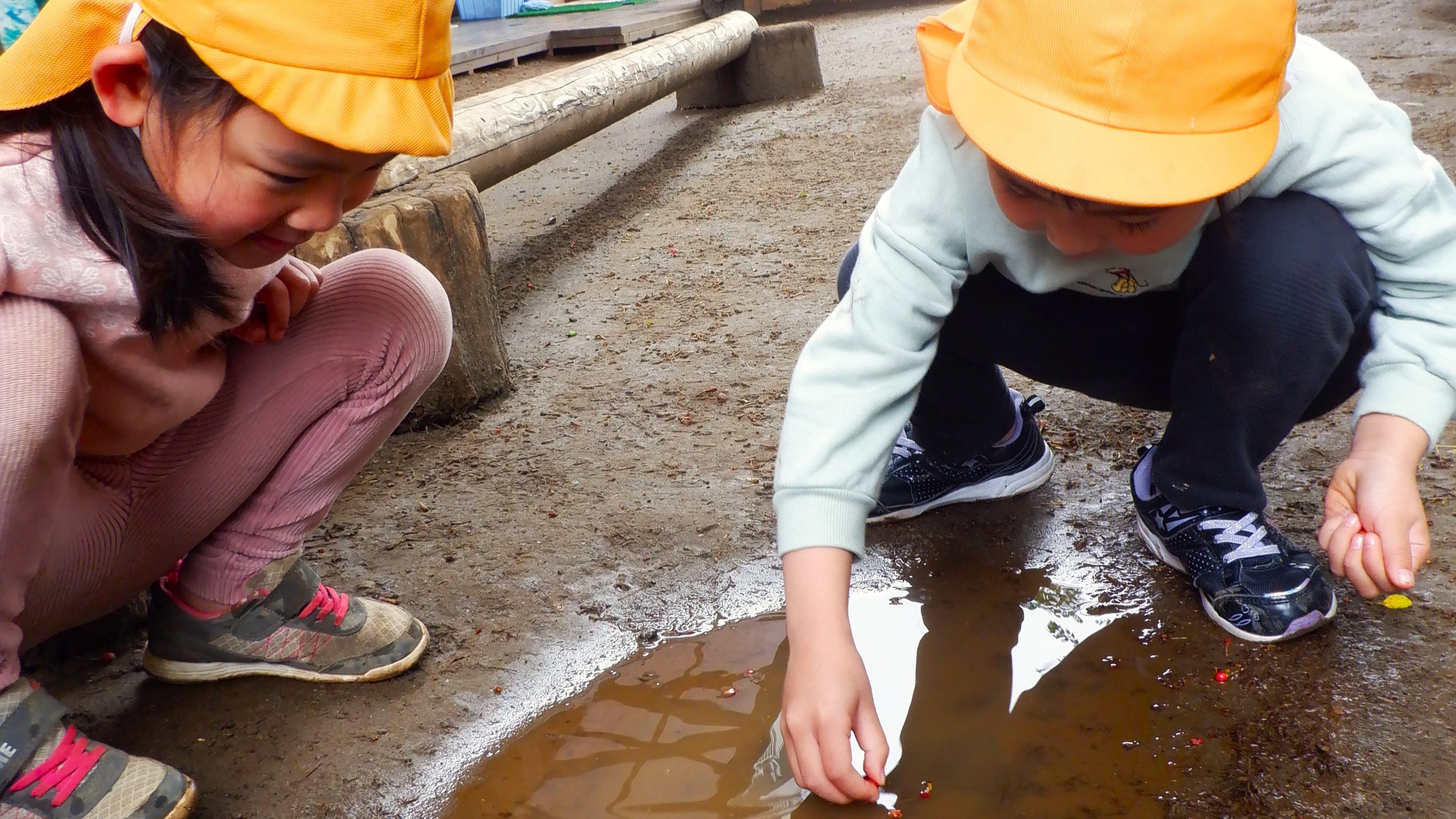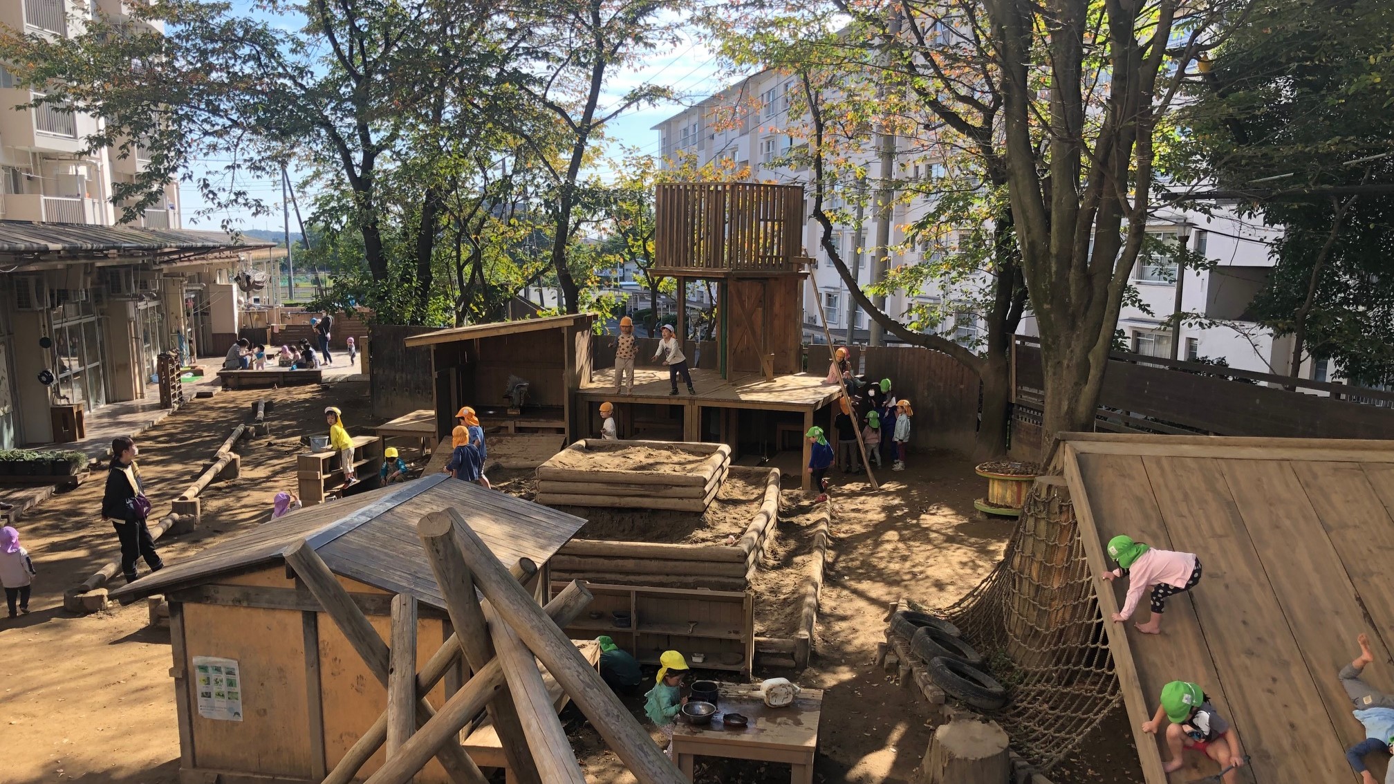 園庭や室内環境の変化をワークショップの様子と共に書いています。